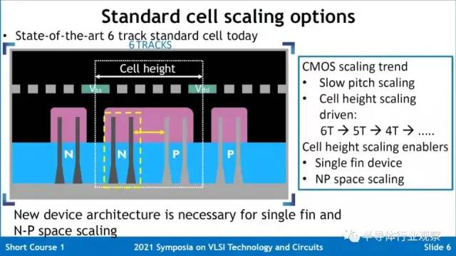 当今最先进的技术是每个设备有 2 个鳍片的 6 轨单元(track cell)。转向单鳍和更窄的 np 间距将需要新的器件架构来提高性能,见图 7。