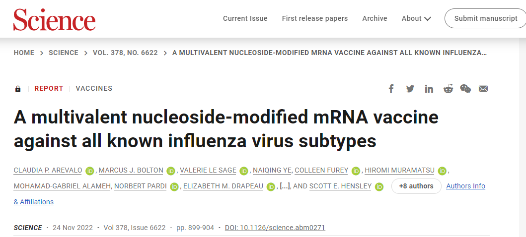 设计和制造能够提供广泛保护的疫苗一直具有挑战性。最新的文章指出,目前的流感疫苗由四种流感病毒抗原组成,除了疫苗所针对的病毒株外,几乎没有其他保护作用。这意味着理论上每年都需要针对当季流行的流感病毒开发新的疫苗,而使用mRNA技术,为通用流感疫苗的开发提供了一种新的策略。