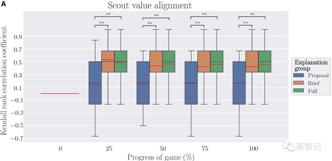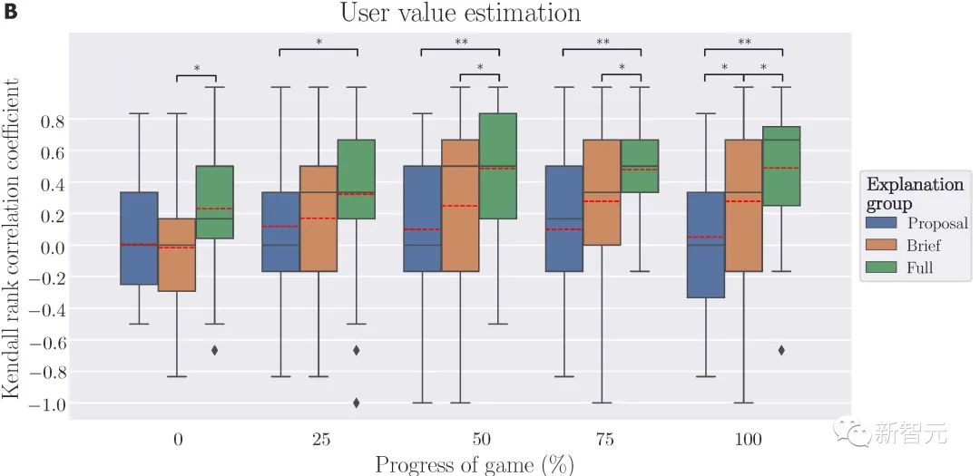 从表达者的角度来看,通过提供适当的解释,机器人可以向用户说明其意图,并帮助人类更好的感知机器人的价值,当给机器提供「完整解释」时,只需在游戏进度达到50%时即可实现人类用户价值与机器人价值的统一,而当只提供「简要解释」时,游戏进度需要达到75%时才能完成价值的统一。