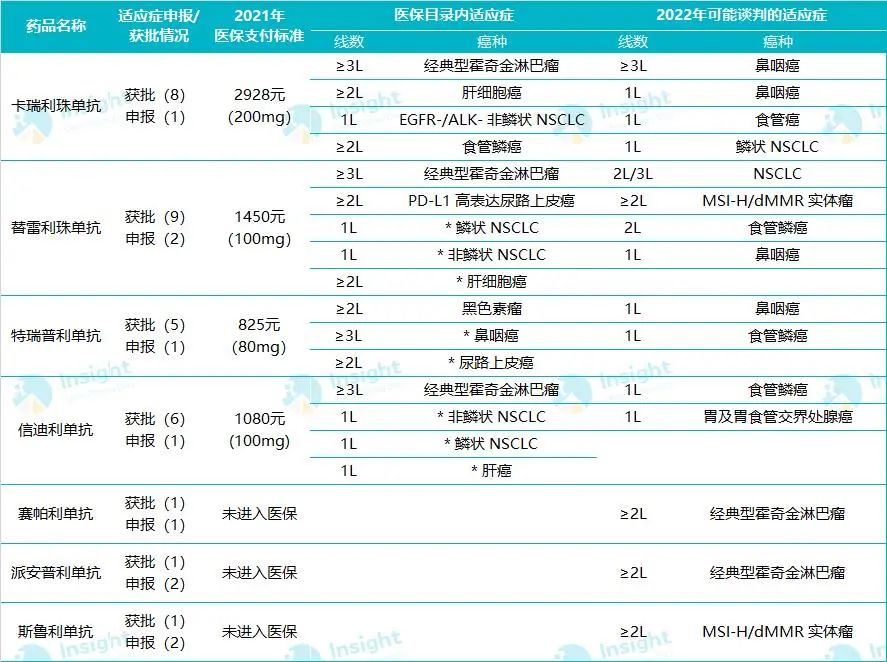 今年 3 月,斯鲁利单抗首次获批上市,单药治疗经标准治疗失败的、不可切除或转移性高度微卫星不稳定型或错配修复缺陷型(MSI-H/dMMR)实体瘤,获得了今年度医保谈判的入门券;而一线鳞状 NSCLC 和一线 ES-SCLC 这两大适应症又分别在 2021 年 9 月、2022 年 4 月申报。