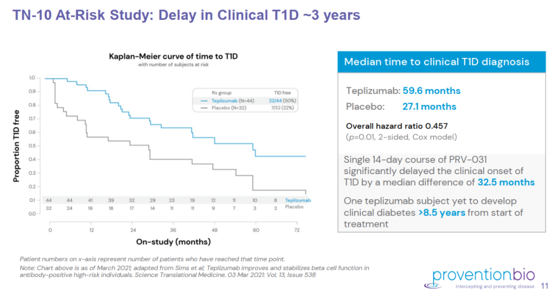 结果显示,Teplizumab组受试者确诊为T1D的中位时间为 59.6个月,而安慰剂组为27.1个月(HR=0.457,P=0.01),Teplizumab治疗使高危儿童和成人群体的发病延迟了约3年(中位数为32.5个月)。在2.5年的中位随访中,Teplizumab组有50%的受试者确诊为T1D,而安慰剂组的确诊人数达78%。这也是第一个证明免疫疗法可以延缓T1D的临床试验。
