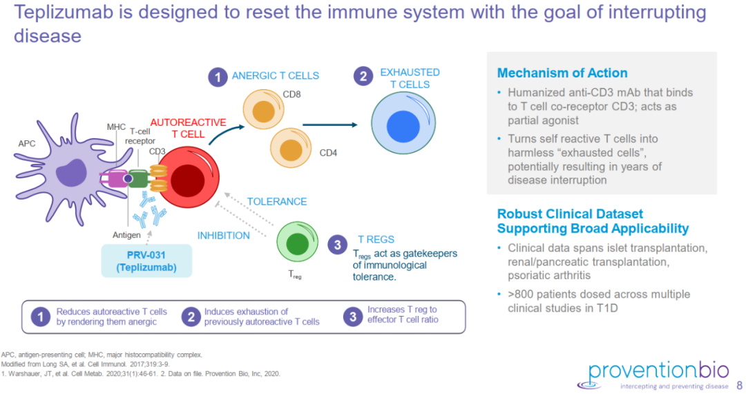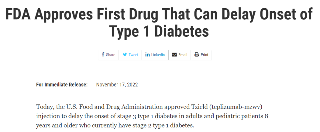 CD3单克隆抗体Teplizumab已获FDA批准上市,用于延缓或预防成人及8岁以上人群的临床1型糖尿病,成为了全球首款改变1型糖尿病疾病进程的疗法。