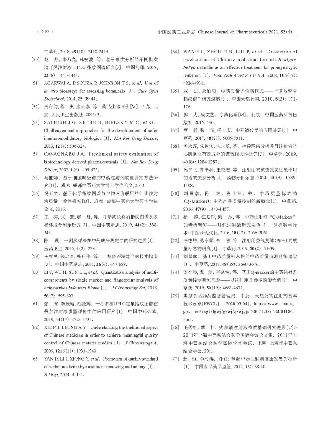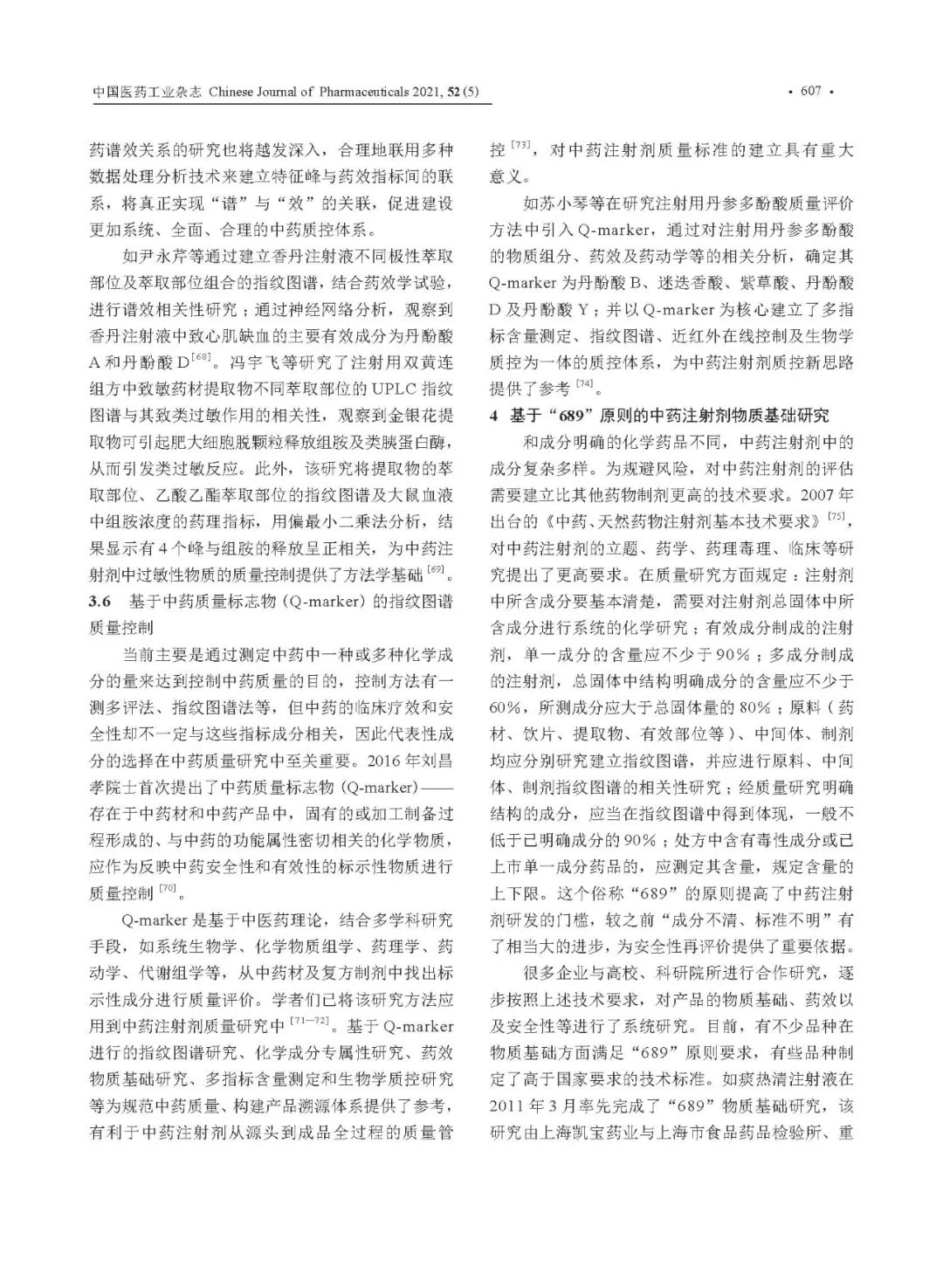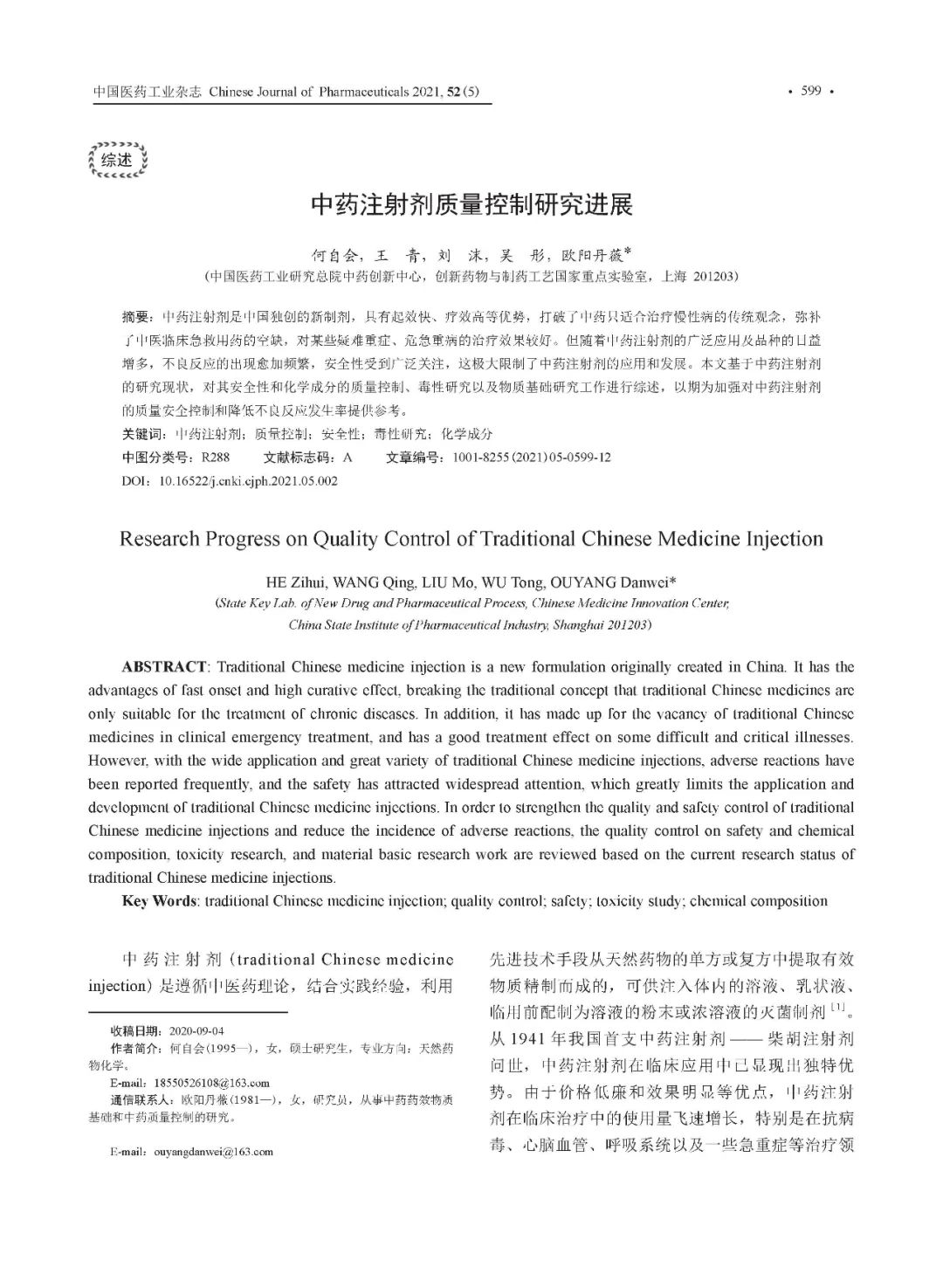 摘要:中药注射剂是中国独创的新制剂,具有起效快、疗效高等优势,打破了中药只适合治疗慢性病的传统观念,弥补了中医临床急救用药的空缺,对某些疑难重症、危急重病的治疗效果较好。但随着中药注射剂的广泛应用及品种的日益增多,不良反应的出现愈加频繁,安全性受到广泛关注,这极大限制了中药注射剂的应用和发展。本文基于中药注射剂的研究现状,对其安全性和化学成分的质量控制、毒性研究以及物质基础研究工作进行综述,以期为加强对中药注射剂的质量安全控制和降低不良反应发生率提供参考。