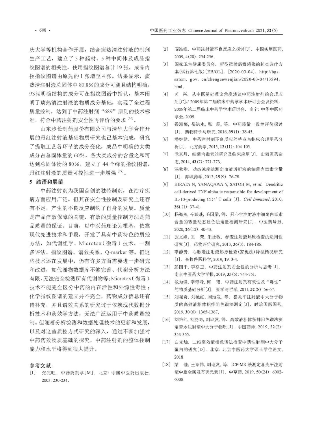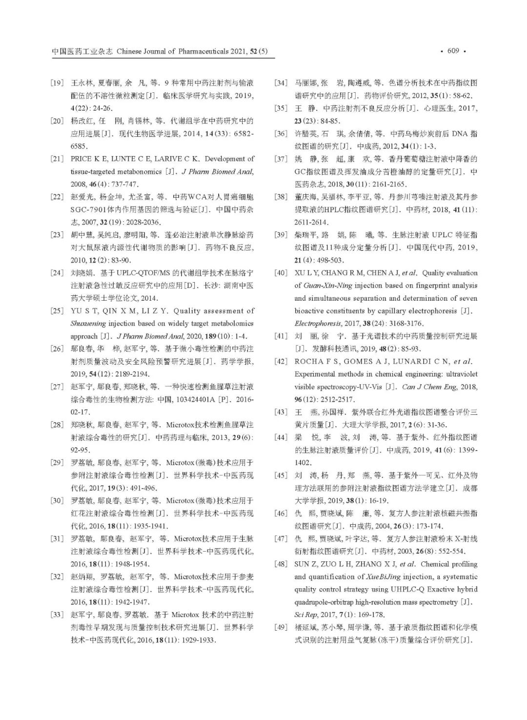 中药注射剂( traditional Chinese medicine injection) 是遵循中医药理论,结合实践经验,利用先进技术手段从天然药物的单方或复方中提取有效物质精制而成的,可供注入体内的溶液、乳状液、临用前配制为溶液的粉末或浓溶液的灭菌制剂[1]。从1941 年我国首支中药注射剂—— 柴胡注射剂问世,中药注射剂在临床应用中已显现出独特优势。由于价格低廉和效果明显等优点,中药注射剂在临床治疗中的使用量飞速增长,特别是在抗病毒、心脑血管、呼吸系统以及一些急重症等治疗领域有着西药不可取代的地位[2]。自2019 冠状病毒病(COVID-19) 疫情爆发以来,在无特效药的情况下,中药注射剂得到了广大中西医临床呼吸和重症专家的认可。中华人民共和国国家卫生健康委员会发布的《新型冠状病毒感染的肺炎诊疗方案( 试行第七版)》中对于重型、危重型COVID-19 患者推荐的中药注射剂有:喜炎平注射液、血必净注射液、热毒宁注射液、痰热清注射液、醒脑静注射液、参附注射液、生脉注射液、参麦注射液[3]。中药注射剂作为现代创新剂型,既有中药的复杂性,又有注射剂剂量准确、给药简单、生物利用度高、疗效迅速的特点,丰富了传统给药方式,解决了不能吞咽、昏迷等患者的用药问题。据调查,在所有药品品种中,中药注射剂的销量一直处于领先地位[4],已发展成制药行业的支柱品种。