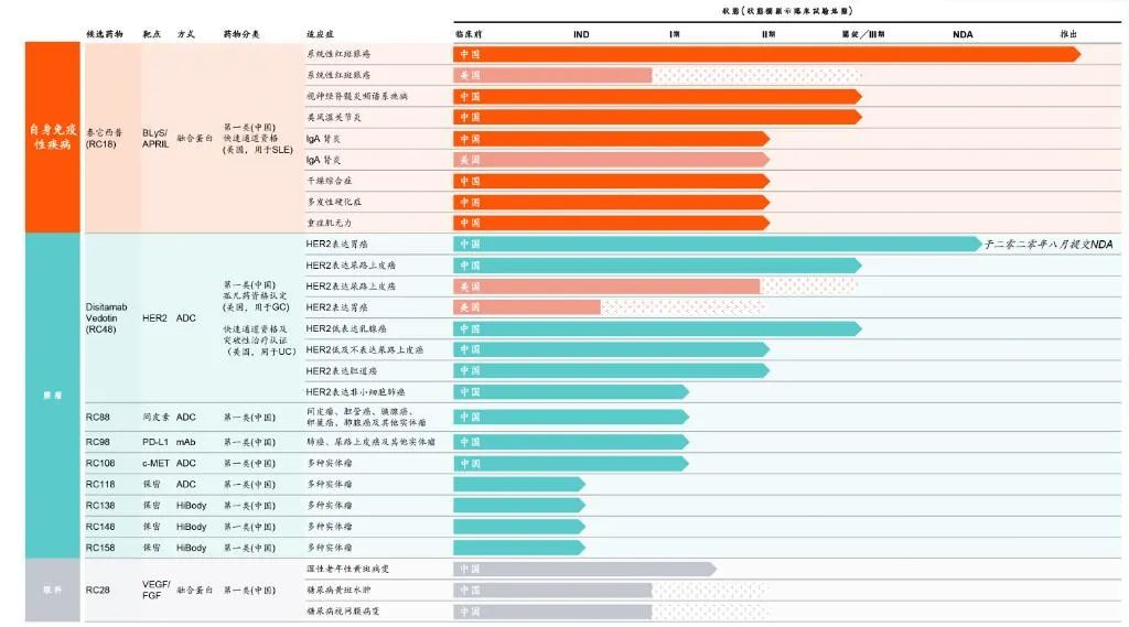 荣昌生物成立于2008年,是一家发现、开发和商业化同类首创和同类最佳药物的生物制药公司,其重点布局自身免疫、肿瘤、眼科等领域,具体的生产管线包括单克隆抗体、融合蛋白、ADC、双功能抗体等,根据荣昌生物官网显示,截止目前,其产品管线包含了10种药物,包括2款融合蛋白药物,以及4款ADC药物。
