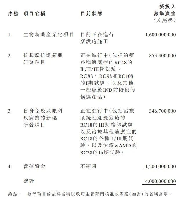 根据荣昌生物公告,其此次赴科创板上市计划募集资金总计约40亿元,将主要用于生物新药产业化项目、抗肿瘤抗体新药研发项目、以及自身免疫及眼科疾病抗体新药研发项目。