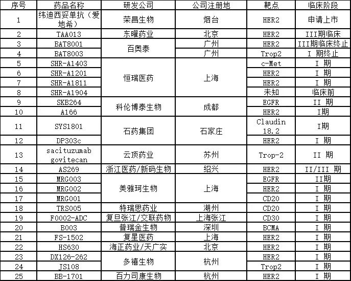 截止目前,全球共有11个款ADC药物获批,包括辉瑞的Mylotarg、Besponsa,罗氏的Kadcyla、Polivy、阿斯利康的Lumoxiti等,均为国外产品,不过,国内的ADC药物研发局面也竞争激烈,有二十多种处于不同阶段临床试验中的ADC药物正在开发中,包括东曜药业、恒瑞医药、科伦药业、云顶新耀、浙江医药等多个公司有产品已经进入临床阶段,除了大多数针对HER2靶点外,其他靶点包括c-Met、EGFR、Trop-2、CD20、BCMA等。
