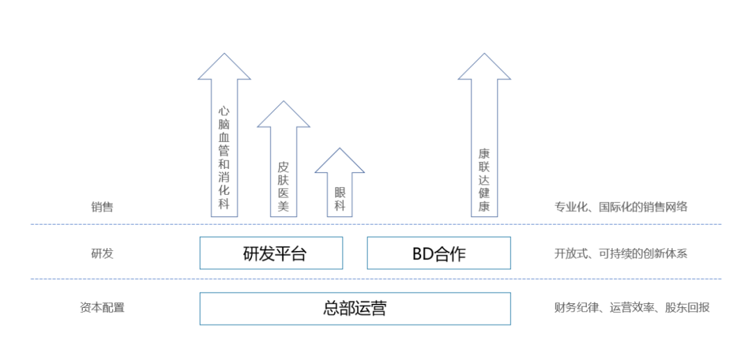 一般来说,药企的销售都是基于科室的条线垂直管理,但是很少有公司会把特定科室的销售团队整合成一家独立的经营主体。康哲基于专科专业化运营的逻辑,把现有国内的销售团队分拆了:1)深圳康哲负责心脑血管和消化科,2)成立康哲美丽聚焦皮肤处方药和医美;3)成立康哲维盛聚焦眼科;同时,基于国际化的逻辑,成立康联达健康,面向东南亚市场搭建本土团队的,完善开发、生产、制剂CDMO、营销推广为一体的平台化业务架构。