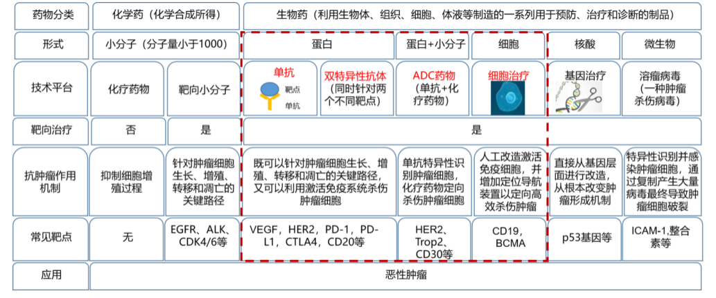 从药物分类的角度看,肿瘤药可以分为化学药和生物药。按照分子量由小到大可以细分为小分子、蛋白、蛋白+小分子、细胞、核酸、微生物,对应的技术类型为化疗药和靶向小分子药、单抗和双抗、ADC、细胞治疗、基因治疗、溶瘤病毒。其中化学药中的靶向小分子药和所有的生物药都可以纳入靶向治疗用药,广义的靶向治疗甚至包括免疫治疗、基因疗法和溶瘤病毒,靶向药物因此也占据了肿瘤药物的半壁江山。