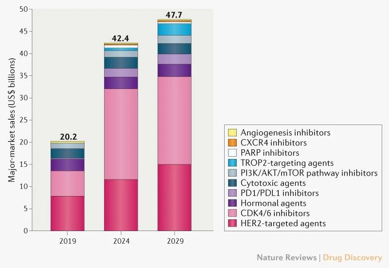 根据Nature Reviews Drug Discovery预测,2019年乳腺癌市场总规模为202亿美元,靶向HER2、CDK4/6的药物占主导,约占销售额的68%;按年增长9%计算,2029年乳腺癌市场总规模将达到477亿美元,这两个靶点药物占销售额的比例将提升到73%。未来几年,来自仿制药和生物类似药的竞争会逐渐激烈,但热门靶点药物HER-2抑制剂的适应症开发、CDK4/6抑制剂的拓展使用还有很大空间,VEGF、EGFR、PARP等其它靶点的研发也会保持热度,乳腺癌市场有望直逼肺癌市场,成为靶向药物大展身手的主战场。