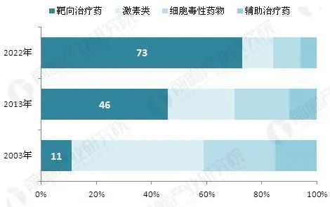 图:2003-2022肿瘤治疗药物市场结构及预测(单位:%)