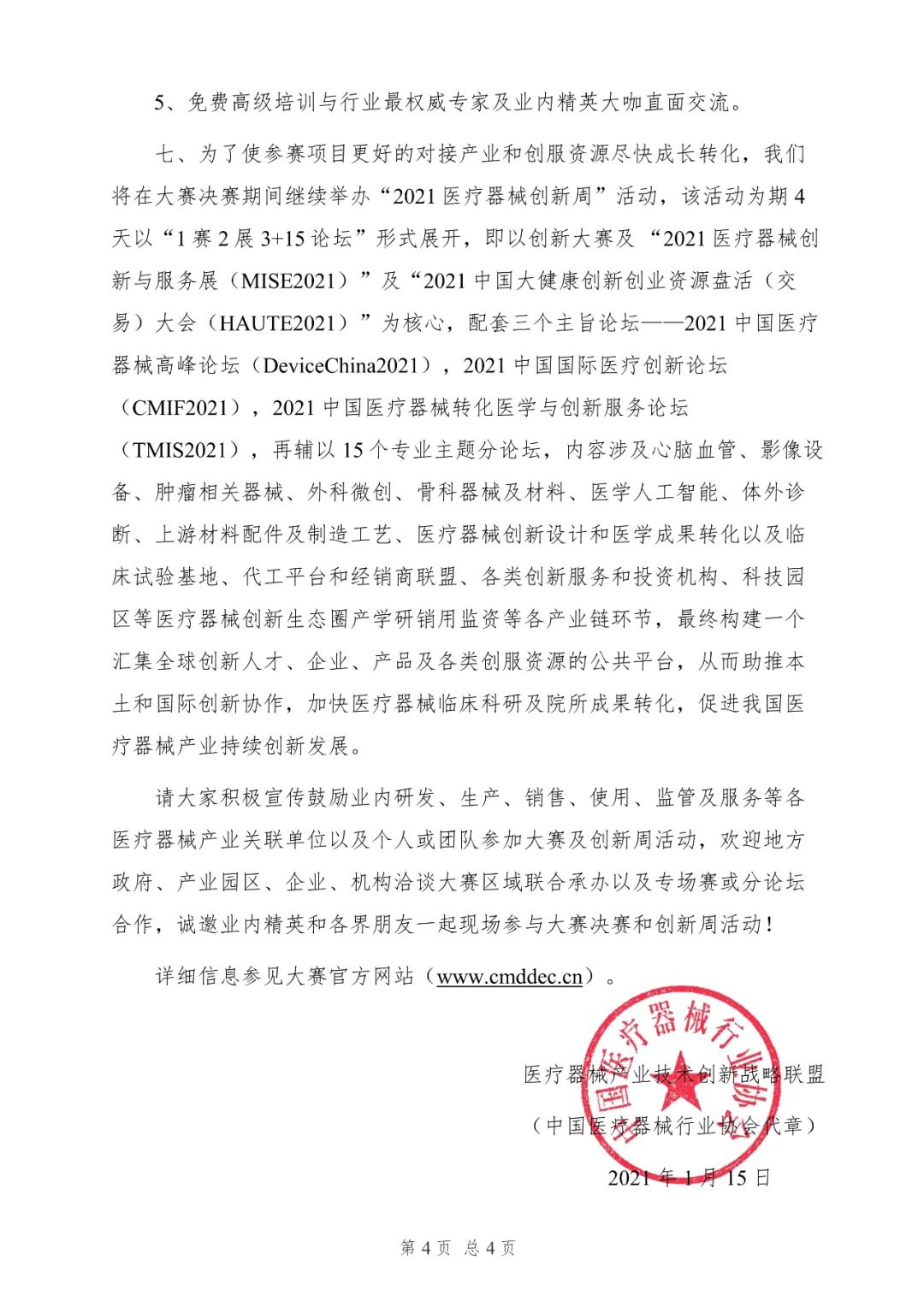 为了使参赛项目更好的对接产业和创服资源尽快成长转化,我们将在大赛决赛期间继续举办“2021医疗器械创新周”活动,该活动为期4天以“1赛2展3+15论坛”形式展开,即以创新大赛及 “2021医疗器械创新与服务展(MISE2021)”及 “2021中国大健康创新创业资源盘活(交易)大会(HAUTE2021)”为核心,配套三个主旨论坛——2021中国医疗器械高峰论坛(DeviceChina2021),2021中国国际医疗创新论坛(CMIF2021),2021中国医疗器械转化医学与创新服务论坛(TMIS2021),再辅以15个专业主题分论坛,内容涉及心脑血管、影像设备、肿瘤相关器械、外科微创、骨科器械及材料、医学人工智能、体外诊断、上游材料配件及制造工艺、医疗器械创新设计和医学成果转化以及临床试验基地、代工平台和经销商联盟、各类创新服务和投资机构、科技园区等医疗器械创新生态圈产学研销用监资等各产业链环节,最终构建一个汇集全球创新人才、企业、产品及各类创服资源的公共平台,从而助推本土和国际创新协作,加快医疗器械临床科研及院所成果转化,促进我国医疗器械产业持续创新发展。