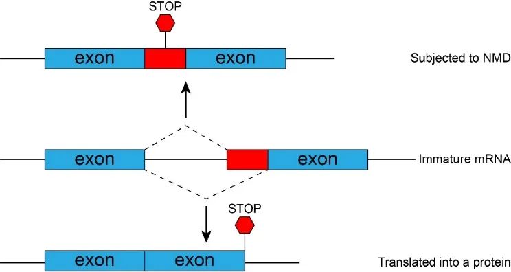 。跳过这个外显子可以产生一条功能性的mRNA,进而翻译出对应的蛋白质。然而,包含这个外显子则会引入提前的终止密码子,导致mRNA被降解,无法从中翻译出蛋白质——这种机制称为“无义介导的mRNA降解