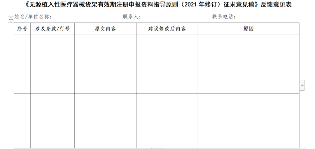 请相关领域的专家、学者、生产企业及有关从业人员提出宝贵意见和建议。相关意见或建议,请下载并填写附件中的《无源植入性医疗器械货架有效期注册申报资料指导原则(2021年修订)》(征求意见稿)反馈意见表,并于2021年7月8日前将反馈意见以电子邮件形式反馈我中心。