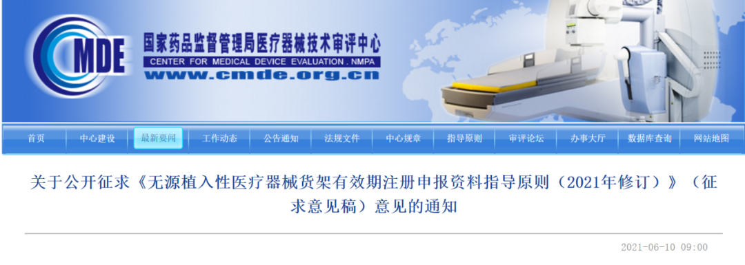 附件: 1.《 无源植入性医疗器械货架有效期注册申报资料指导原则(2021年修订)》(征求意见稿)(下载)