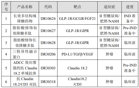 在临床前动物实验中,DR10628 呈现良好的降糖和减重药效,并具有良好的长效特征。适应症为 II 型糖尿病、肥胖等代谢疾病。该产品计划于 2022 年 6 月前申请临床。