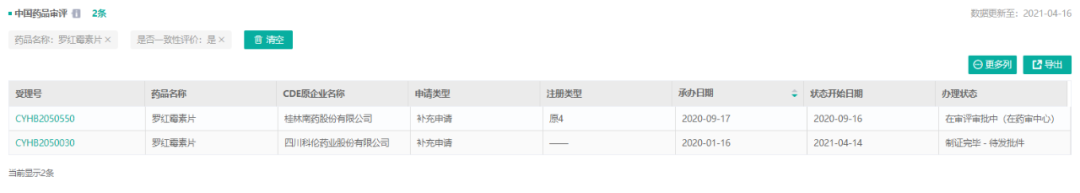 根据药融云数据显示,目前国内的罗红霉素片的一致性评价申请只有两家,为四川科伦药业和桂林南药,四川科伦的罗红霉素片率先通过一致性评价成为该品种的首家。桂林南药的罗红霉素片目前正在审评审批中(在药审中心)。
