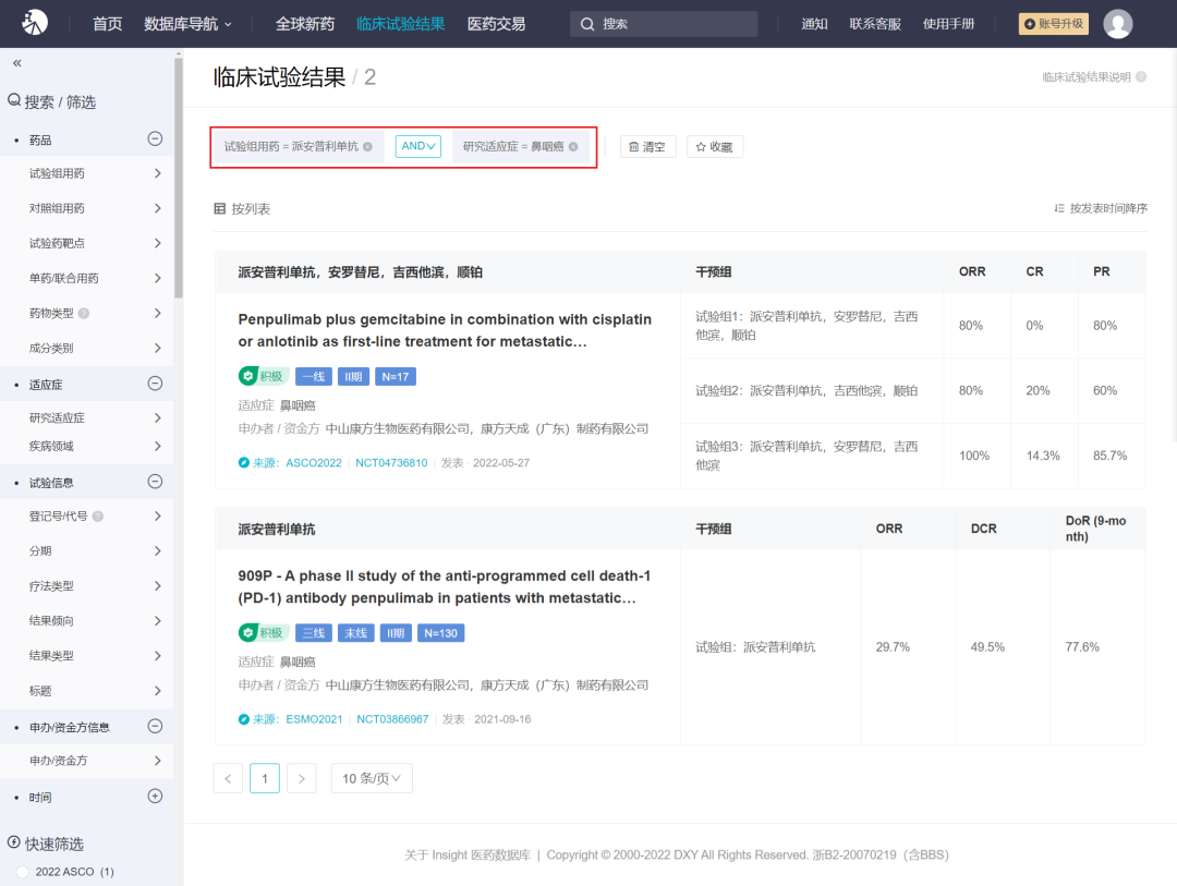 派安普利治疗二线以上化疗后疾病进展的鼻咽癌的 II 期临床研究共有 130 名患者入组,111 名符合免疫相关反应标准(IRRC)评估的患者的客观缓解率(ORR)达 29.7%,1 例达到完全缓解(CR);疾病控制率(DCR)达 49.5%。截至 2021 年 2 月 3 日,中位随访时间为 14.7 个月。IRRC 评估的中位无进展生存期(PFS)达 3.65 个月,中位总生存期(OS)达 18.63 个月。