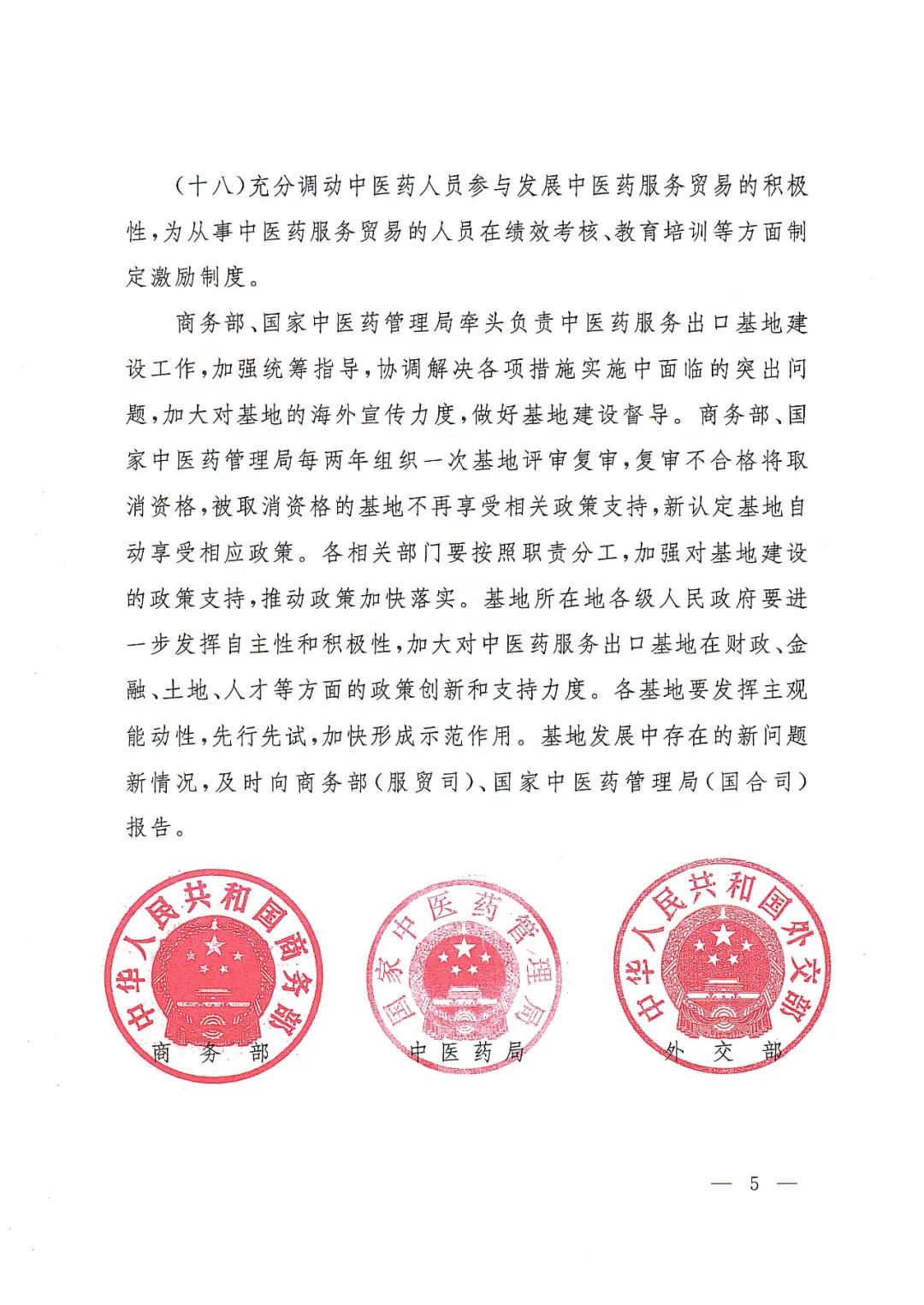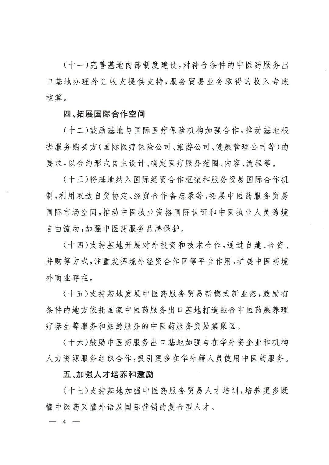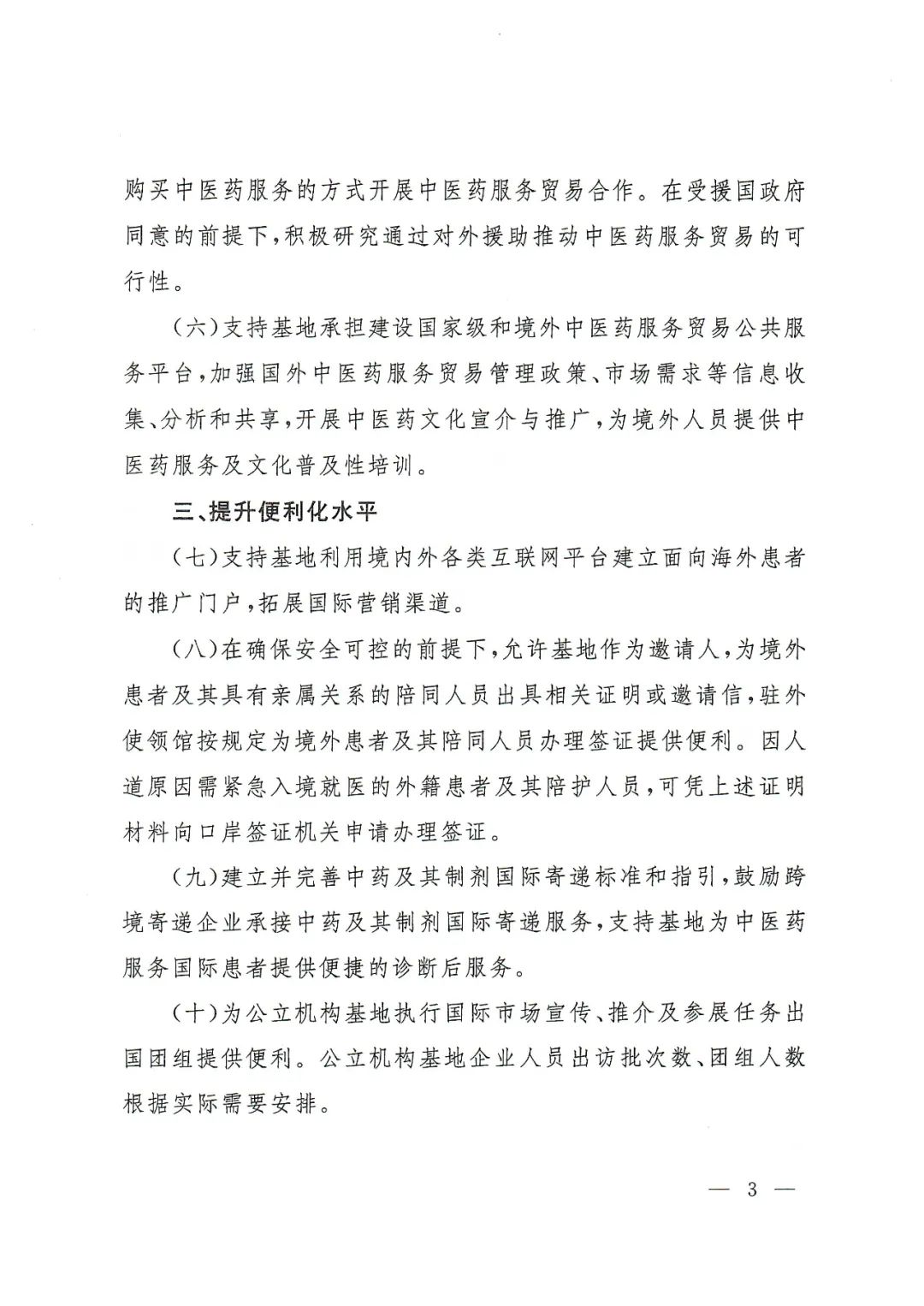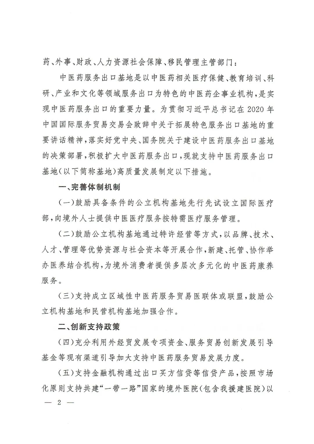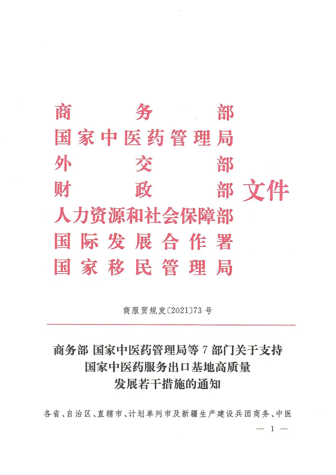 为全面贯彻习近平总书记关于拓展特色服务出口基地的重要指示精神,落实《中共中央国务院关于促进中医药传承创新发展的意见》关于推动中医药走出去的决策部署,近日商务部、国家中医药管理局等7部门联合印发了《关于支持国家中医药服务出口基地高质量发展若干措施的通知》(商服贸规发﹝2021﹞73号),从完善体制机制、创新支持政策、提升便利化水平、拓展国际合作空间、加强人才培养和激励五个方面提出18条具体政策措施,着力完善发展环境,形成部门政策合力,支持国家中医药服务出口基地大力发展中医药服务贸易,推动中医药服务走向世界。