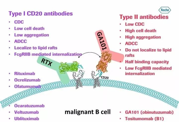 CD20抗体分为I型和II型,作用机制有很大的不同。Type I型如利妥昔单抗、奥法木单抗等,与CD20的结合会将CD20定位到脂质双分子层