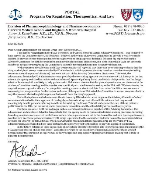 据了解,最新近辞职的是哈佛医学院的医学教授Aaron Kesselheim,他在发往FDA外周与中枢神经系统委员会的辞职信中明确指出:对aducanumab的批准可能是美国近代史上最糟糕的药品批准决定,其还表示:“在最后一刻,基于该药物对脑淀粉样蛋白的影响可能有助于阿尔茨海默病患者这一有争议的前提,该机构将其审查转为加速批准途径,这将破坏对这些患者的护理、公众对 FDA 的信任、对有用的治疗创新的追求以及医疗保健系统的可负担性。”