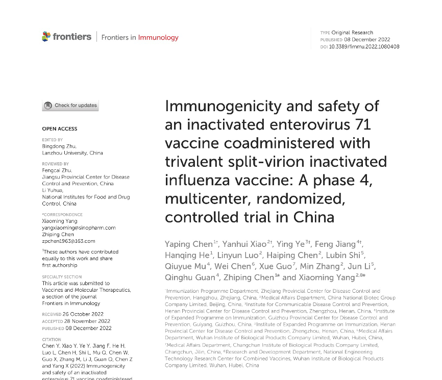 近期,在《Frontiers in Immunology》发表了一篇题为《肠道病毒71型灭活疫苗与3价流感疫苗同时接种的免疫原性与安全性评价:在中国开展的一项4期、多中心、随机、对照临床试验》(《Immunogenicity and safety of an inactivated enterovirus 71 vaccine coadministered with trivalent split-virion inactivated influenza vaccine: A phase 4, multicenter, randomized, controlled trial in China》)的论文。研究结果证实:肠道病毒71型灭活疫苗(EV71疫苗)与3价流感疫苗(IIV3疫苗)同时接种的免疫策略安全可行且免疫效果不受干扰。
