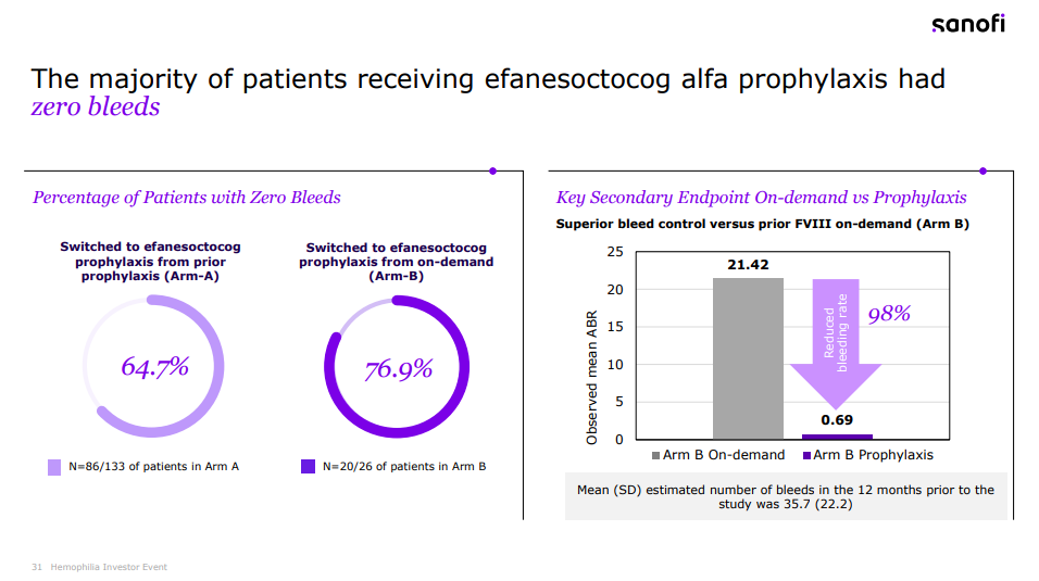试验结果显示,每周一次Altuviiio预防性治疗可显著降低严重血友病A患者中的年出血率,在每周接受一次ALTUVIIIO预防性治疗的A组患者中,52周内中位年出血率(ABR)为0,平均ABR为0.71,达到了具有临床意义的出血预防的主要终点。安全性方面,Altuviiio展现良好的耐受性,没有观察到凝血因子VIII抑制剂的产生。XTEND-1试验详细结果发表于今年1月的《新英格兰医学杂志》。