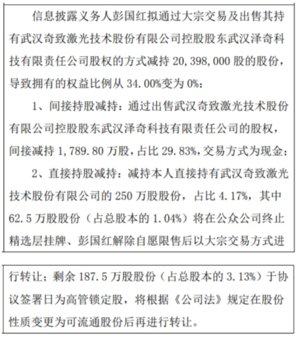 而就在同一日,奇致激光股东彭国红在股转系统通过大宗交易方式减持2039.8万股,权益变动后不持有公司股份。
