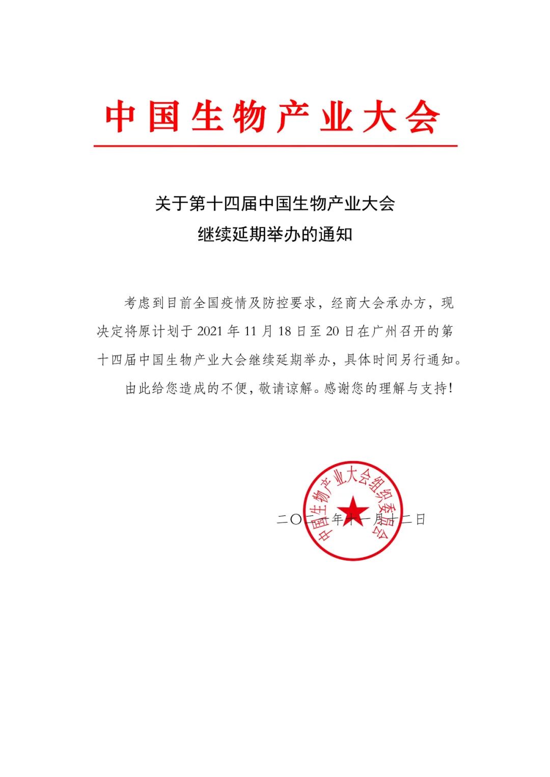 关于第十四届中国生物产业大会继续延期举办的通知