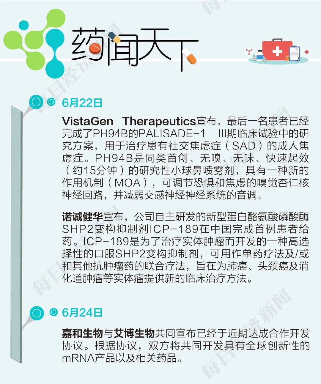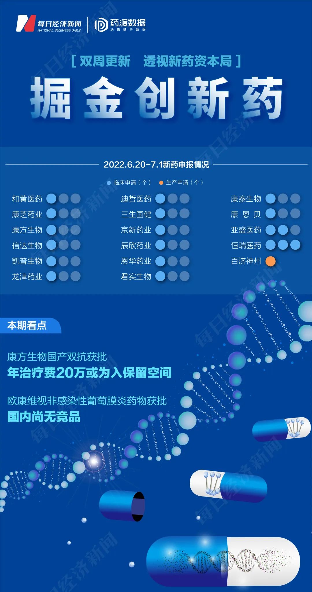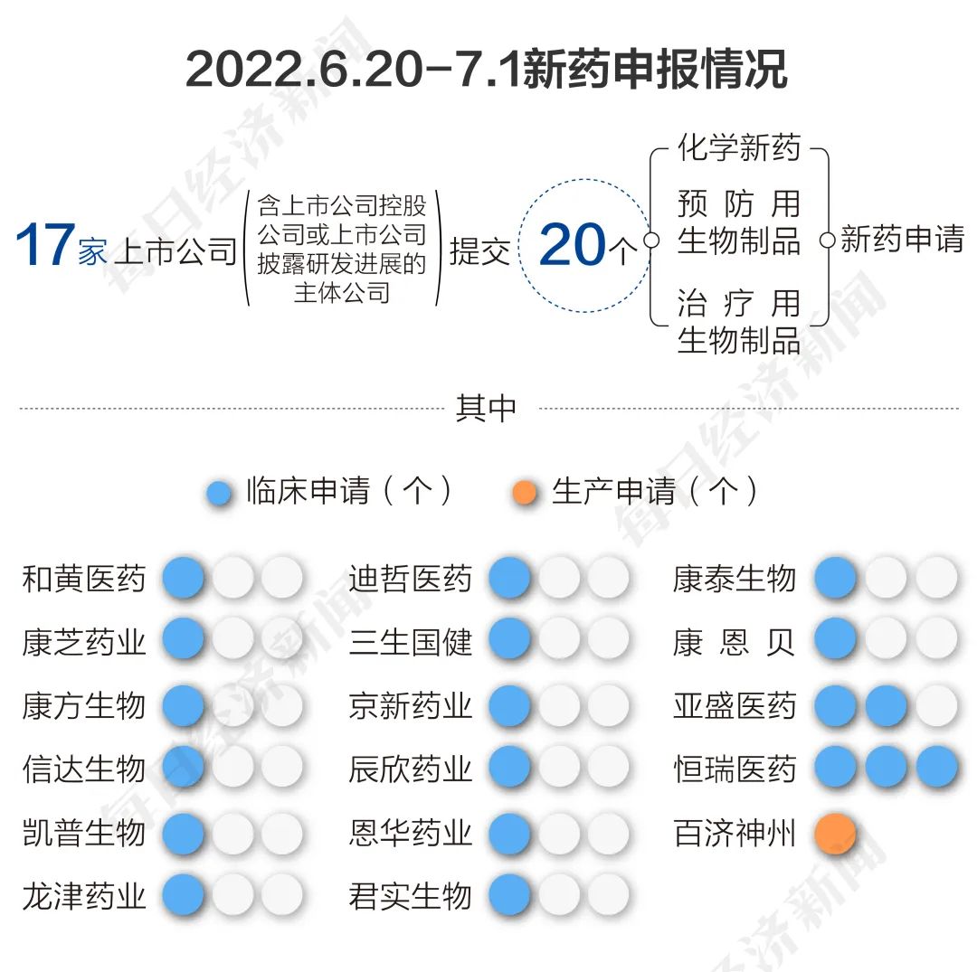 2022年6月20日至7月1日期间,上市公司方面,和黄医药(00013.HK)、康芝药业(300086.SZ)、康方生物(09926.HK)、信达生物(01801.HK)、凯普生物(300639.SZ)、龙津药业(002750.SZ)、迪哲医药(688192.SH)、三生国健(688336.SH)、京新药业(002020.SZ)、辰欣药业(603367.SH)、恩华药业(002262.SZ)、君实生物(688180.SH)、康泰生物(300601.SZ)、康恩贝(600572.SH)分别提交1个临床申请。亚盛医药(06855.HK)提交2个临床申请,恒瑞医药(600276.SH)提交3个临床申请。百济神州(688235.SH)提交1个生产申请。