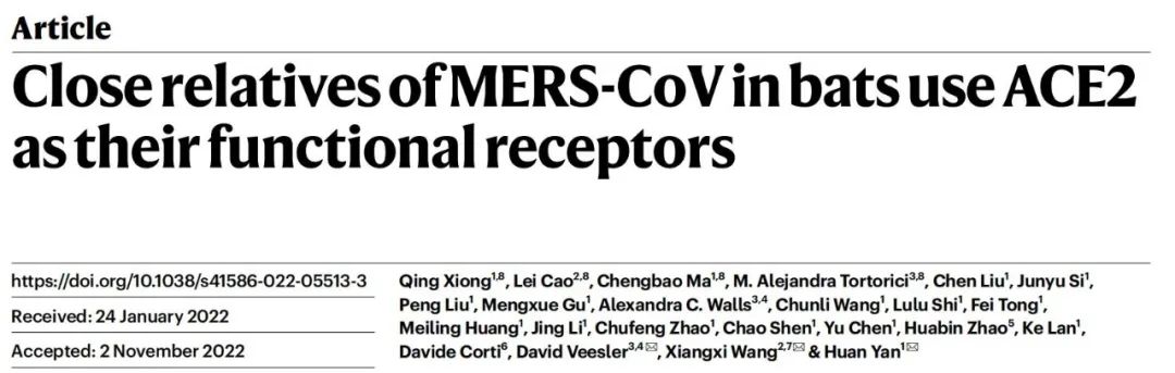 2022年12月07日,Nature (《自然》)期刊以长文 (Article) 形式在线发表了武汉大学病毒学国家重点实验室/生命科学学院严欢研究组在病毒受体领域的最新研究成果,论文题为“Close relatives of MERS-CoV in bats use ACE2 as their functional receptors”(《MERS冠状病毒在蝙蝠中的近亲病毒使用ACE2作为它们的功能性受体》)。