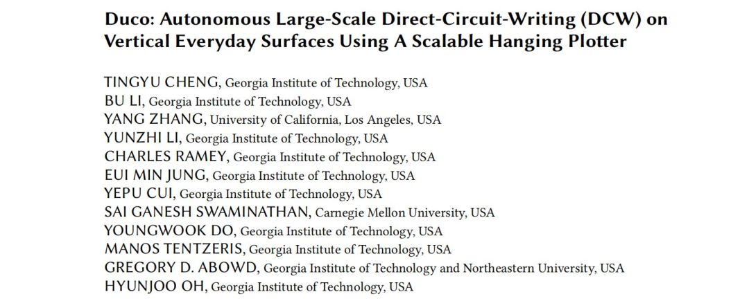9 月 14 日,相关论文以《Duco:使用可伸缩的悬挂式绘图仪在垂直的日常表面上进行自动化大规模电路书写(DCW)》(Duco: Autonomous Large-Scale Direct-Circuit-Writing (DCW) on Vertical Everyday Surfaces Using A Scalable Hanging Plotter)为题,发表在人机交互的顶级会议 IMWUT/ubicomp 上,主题是用机器人在日常表面绘制大型电路。