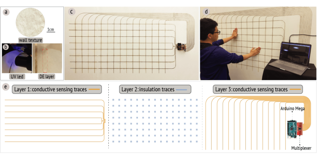 它背后的关键思想是在日常生活表面上打印单层、或多层大型电路。日常建筑表面非常普及,但实际上多用于结构性功能。比如墙就是一个很好的例子,在日常中广泛存在,但只用来隔开屋子或者支撑建筑,并没有任何交互特性。