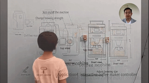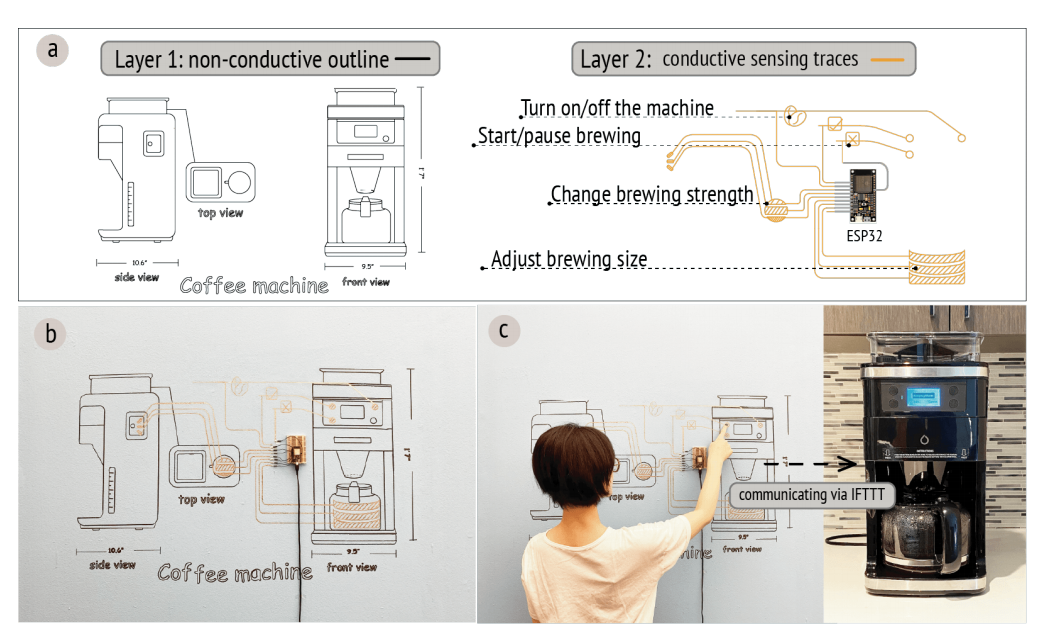 在墙上画一副电路,就可以连接并控制家庭中已有的物联网设备, 比如咖啡机和电灯等。