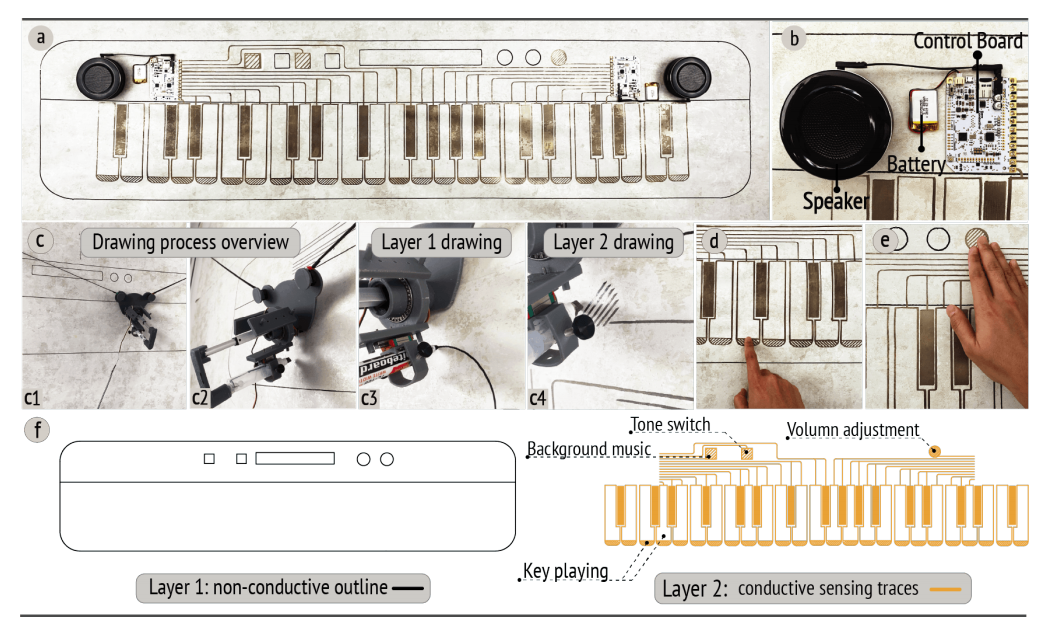 其一是在墙上画一些交互型图案,研究中程听雨展示了一架 160 厘米乘 32 厘米大小的独立互动钢琴。这一应用突出了 Duco 系统绘制复杂且准确的电路的能力。