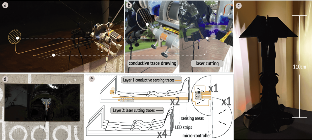 其四,除了直接进行电路绘制,也可把绘制好的电路切割下来重新组装。比如在墙面上挂一个大型亚克力板,然后在上面绘制电路,这时使用一个激光切割装置进行切割,就能组装成 3D 形状。其五,还可通过这种方法制作大型交互落地灯。
