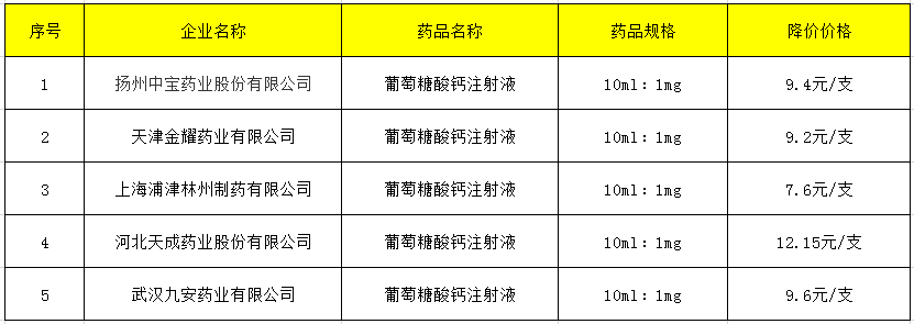 具体涉及降价的企业以及品种(规格)是:扬州中宝药业股份有限公司、天津金耀药业有限公司、上海浦津林州制药有限公司、河北天成药业股份有限公司和武汉九安药业有限公司生产的葡萄糖酸钙注射剂(规格10ml:1mg)的挂网价格分别降至9.4元/支、9.2元/支、7.6元/支、12.15元/支和9.6元/支。