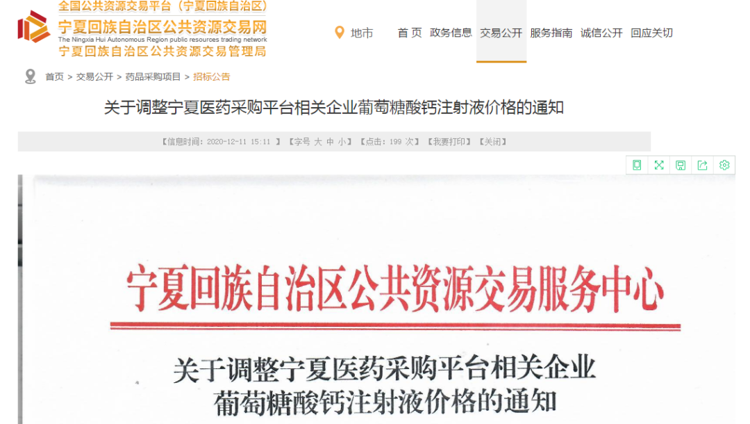 12月11日,宁夏回族自治区公共资源交易网印发通知称,根据扬州中宝药业、天津金耀药业和武汉久安药业等5家药企的申请,对它们生产的葡萄糖酸钙注射液进行降价调整。