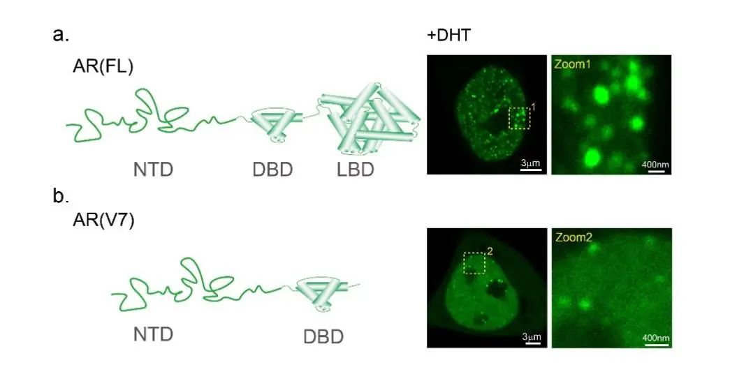 在这项研究中,科研人员发现雄激素二氢睾丸酮(dihydrotestosterone, DHT)可以诱导AR入核发生液-液相分离并形成激活的转录凝集体(图1a)。OptoIDR实验表明AR的相分离能力是主要由NTD结构域驱动的。由于AR-V7具有完整的NTD和DBD结构域,AR-V7即使在雄激素不存在的条件下仍然可以进入细胞核,并形成转录凝聚体(图1b)。