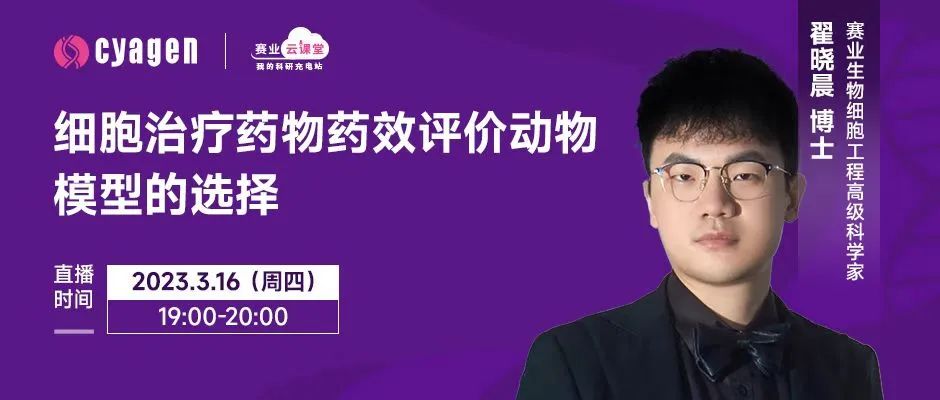 为进一步探讨相关议题,3月16日(周四)晚7点,赛业生物细胞工程高级科学家翟晓晨博士为大家带来「关于细胞治疗药物研发的动物模型选择」线上课程,从管线开发、临床试验、技术应用这几个方面的现状进行分析,再落到具体的研发场景中来讲解小鼠模型构建、药物药效评价等一应细节,借此与大家共同展望这项医学技术变革的未来。「码」上报名,相约云端!
