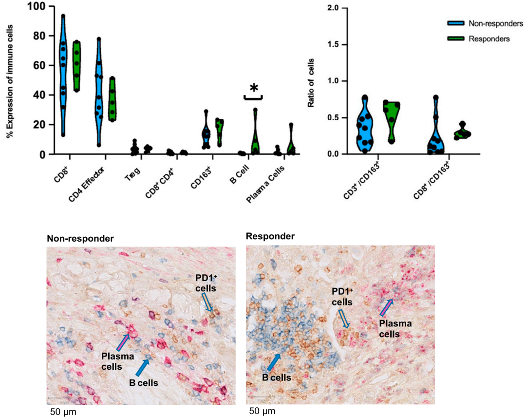 与生物制药小编之前文章《颠覆!B细胞才是免疫检查点抗体最佳预测标志物,而非T细胞》报道一致,治疗前样本中,B细胞数量在应答患者和非应答患者间有最好的区分度。免疫组化染色,可以清晰的看出,应答患者有结构完整的三级淋巴结构的形成,在这里B细胞等可以更好的激活细胞毒性T细胞,使其产生细胞毒性表型。