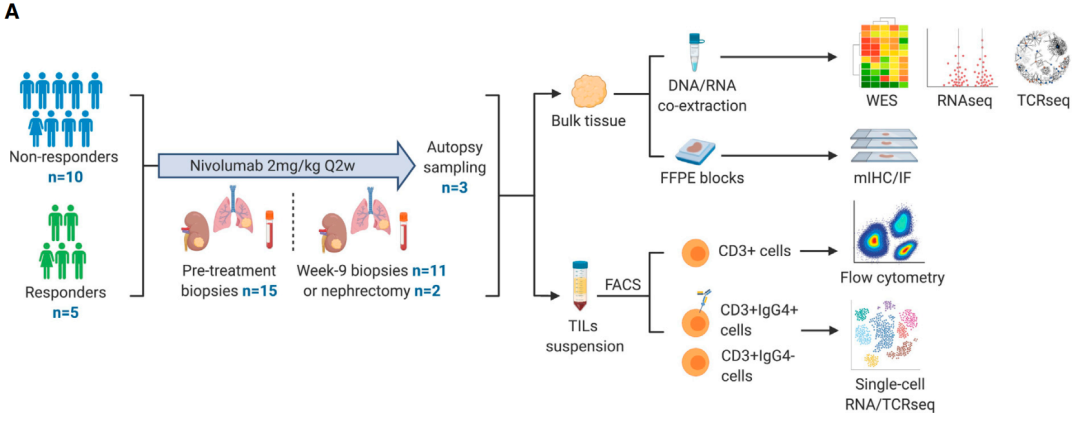 NCT03004755)研究,以扩大分析的时空广度。综合分析nivolumab应答、全外显子和RNA测序(RNA-seq)、TCR测序和免疫组化/多重免疫荧光(IHC/mIF)数据;并进行高维流式细胞术分析。