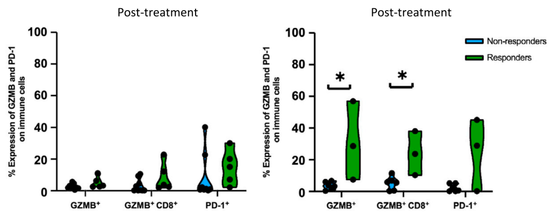 治疗之后进行分析,有应答的患者,其CD8+T细胞细胞毒性标志物颗粒酶B(GZMB)明显上调,而无应答患者没明显变化。