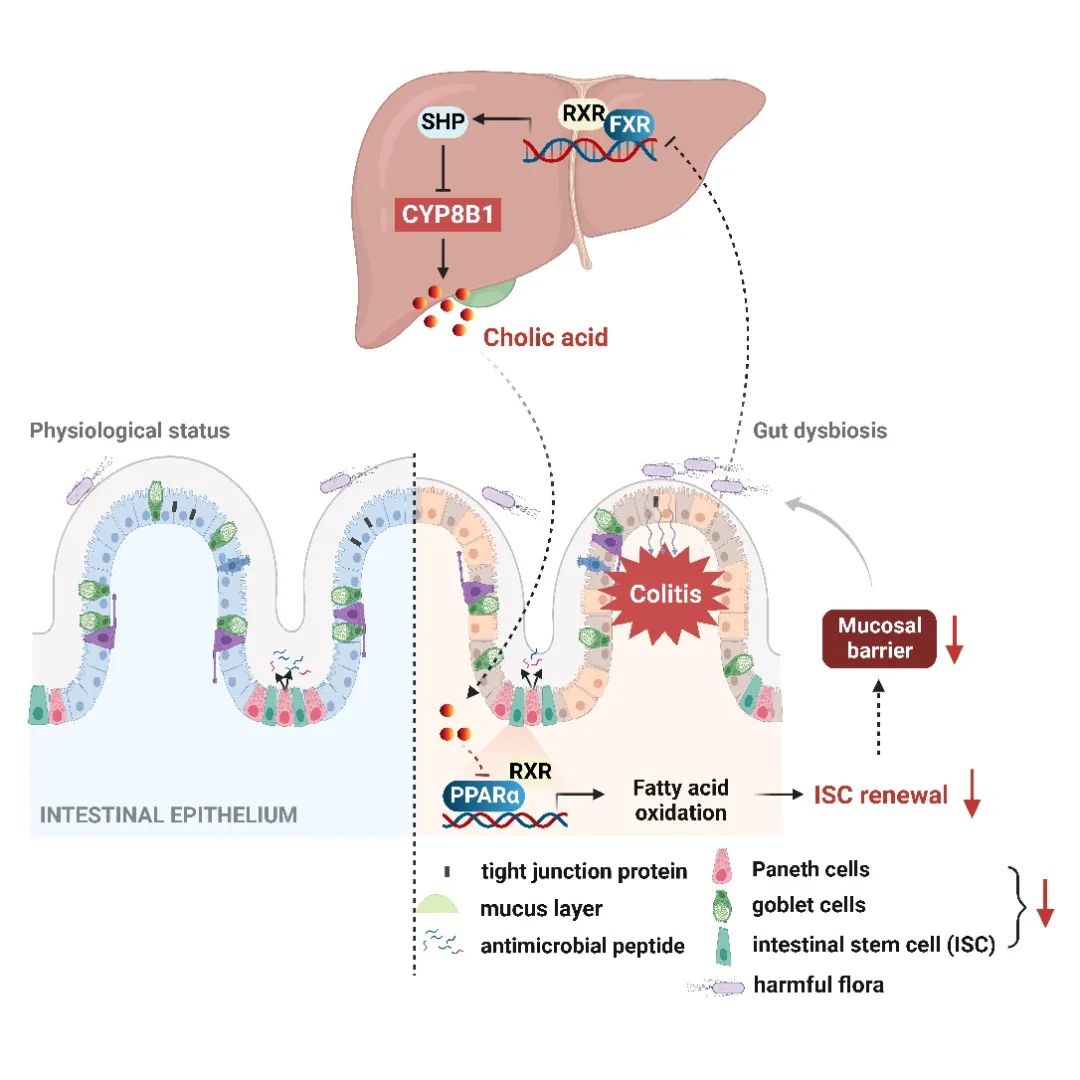 研究者们发现活动期IBD患者和结肠炎小鼠体内出现胆汁酸代谢紊乱,CA水平显著升高,肝脏CYP8B1活性增加,提示肝脏CYP8B1-CA代谢轴的过度活化与IBD进展存在关联。外源补充CA或在小鼠肝脏中过表达CYP8B1,均可加重IBD病理表型,损伤肠道屏障及ISCs更新能力。相反,CYP8B1缺失则显著缓解肠道损伤和炎症,回复ISCs更新能力。