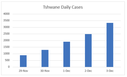从11 月 29 日至 12 月 3 日每日新增的新冠肺炎病例,每天新增的人数都在增加,图片来自sacronavirus.co.za
