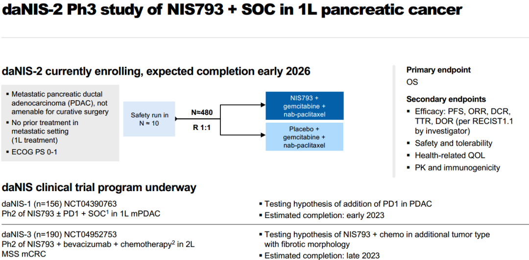 诺华已启动III期daNIS临床试验计划,重点研究NIS793联合化疗在1L PDAC (daNIS-2)和2L CRC (daNIS-3)中的作用,针对PDAC的研究将于2026年完成。