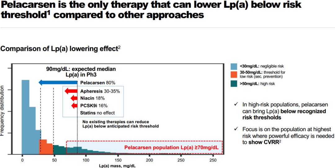 与其他疗法(PCSK9i、他汀类、烟酸类、血浆净化)相比,Pelacarsen是唯一能将Lp(a)降低到风险阈值以下的治疗方法。