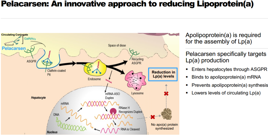 Pelacarsen是新一代的反义寡核苷酸(ASO)药物,通过GalNAc递送系统,Pelacarsen可以进入肝细胞,与载脂蛋白(a)mRNA结合,靶向抑制载脂蛋白(a)在肝脏中的合成,从而降低脂蛋白(a)在血浆中的水平。目前尚无能够有效降低血循环中脂蛋白(a)浓度的药物获批上市。Pelacarsen将有望成为首个靶向强效降低脂蛋白(a)并带来心血管获益的药物。