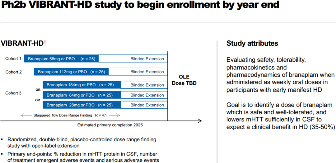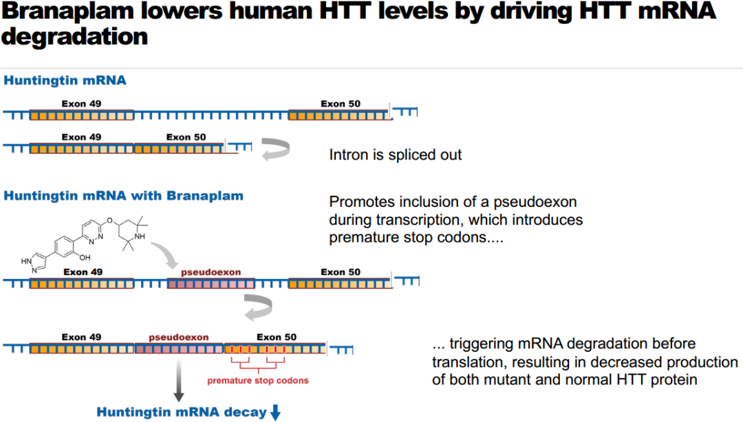 大约有7万名G6亨廷顿舞蹈症(HD)患者的需求未得到满足,目前没有批准的延迟疾病发作或缓慢进展的疾病修饰疗法。Branaplam是一种口服RNA剪接调节剂,通过驱动HTT mRNA降解来降低HTT(亨廷顿蛋白),并有可能成为首个改善HD疾病的疗法。
