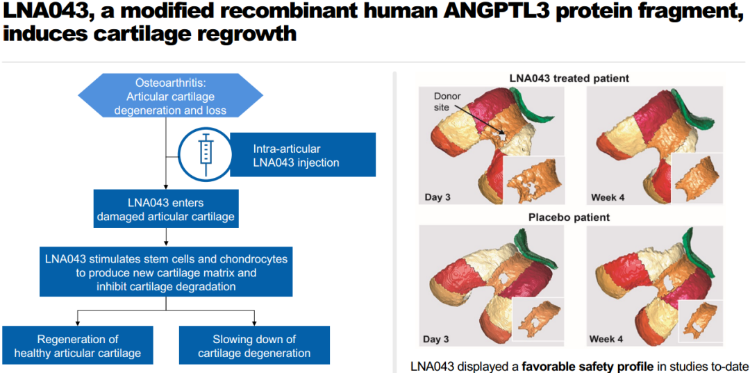 全球有3亿人患有骨关节炎(OA),其中膝关节OA最为常见,目前尚无可改善疾病的治疗方法。LNA043是一款修饰的重组人ANGPTL3蛋白片段,可诱导软骨再生。LNA043有望成为first-in-class膝关节炎疾病修饰疗法,。
